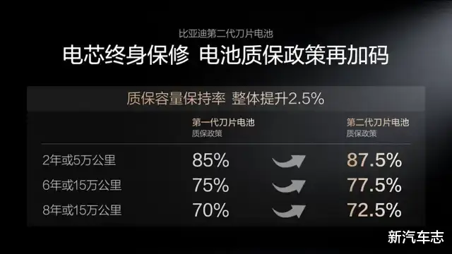 第二代刀片电池通过打造“锂离子高速通道”和“全温域智能热管理系统”,实现了更低的产热和更高效、均匀的散热,让闪充对电池寿命几乎没有影响。基于这样的底气,比亚迪还宣布电池质保政策再加码!第二代刀片电池质保的“容量保持率”整体提升2.5%,电芯依旧是“终身保修”,这就是第二代刀片电池,给所有用户的安心承诺。