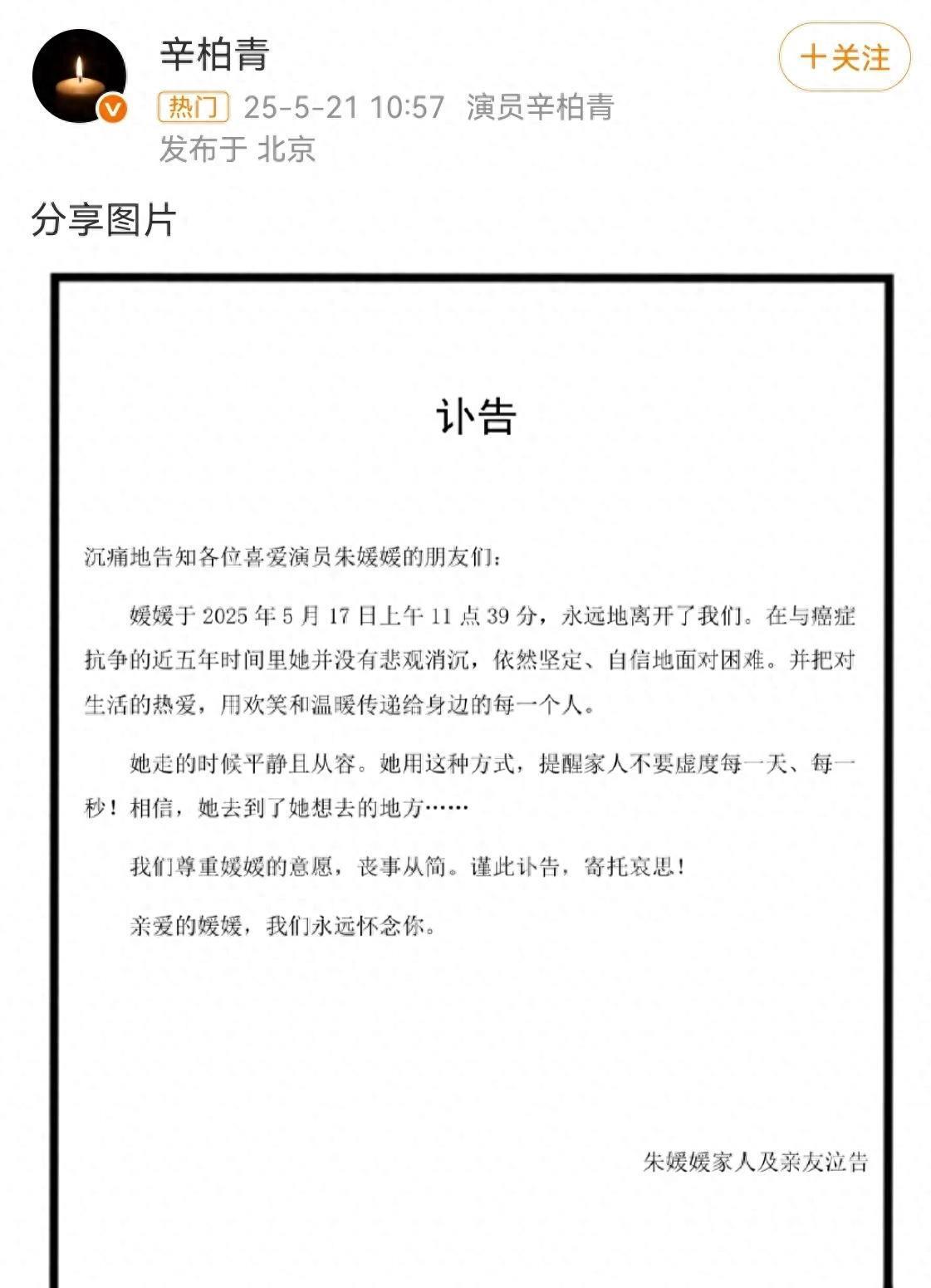 5月21日中午,演员辛柏青颤抖着手发了一则讣告。 短短三行字,炸翻了整个娱乐圈——他的妻子朱媛媛,那个总在电视剧里演“国民媳妇”的女人,抗癌五年后突然走了,才51岁。