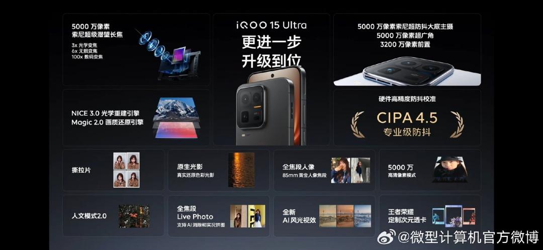 极致玩家战机全链路Ultra旗舰体验影像方面,新机后置采用超防抖大底主摄、潜望长焦和超广角组成的5000 万像素三摄及 3200 万像素前置镜头,主摄与潜望长焦支持 CIPA 4.5 级防抖,搭载 vivo 最新 NICE 3.0 影像算法与 Magic2.0 画质还原引擎,新增原生光影、撕拉片风格滤镜、AI 风光大师等功能,可全场景出大片。