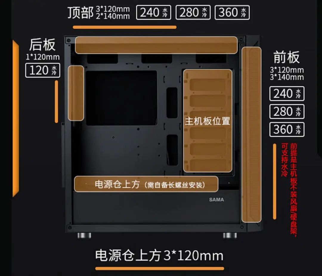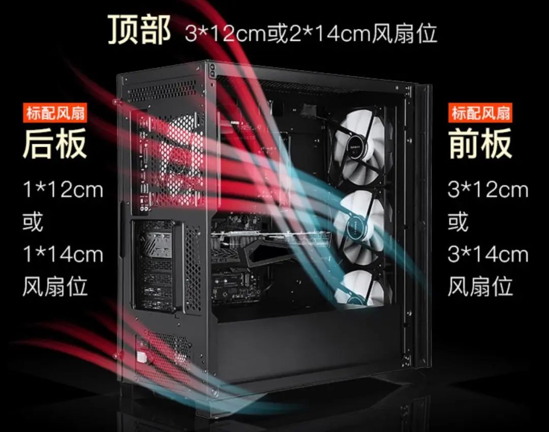 前后各配备 1 个 12cm 降噪风扇,支持 360mm 水冷散热器。