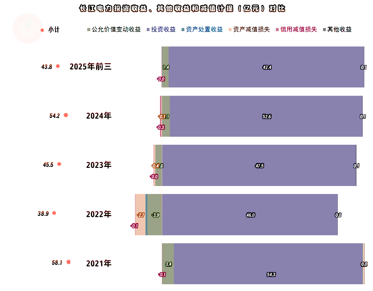在其他收益方面,长江电力每年都是大额净收益的状态,主要是“投资收益”和“公允价值变动收益”。“投资收益”中有少量是金融性质的投资,主要的收益是来自于“对联营企业和合营企业的投资收益”,这些收益与其高达700多亿元的“长期股权投资”和40多亿元的“其他权益工具投资”等有关。个别年份也有少量的“信用减值损失”等情况,但不仅金额不高,发生的频率也较低,并不重要。