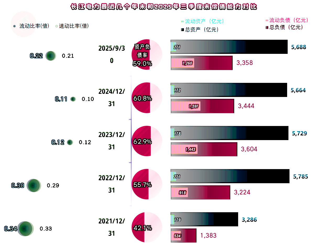 长江电力的资产负债率为六成左右,似乎并不是太高。但是,由于其资产结构太重,短期偿债能力看起来就比较夸张了,仅为0.2倍左右的流动比率和速动比率,好像比爆雷前的恒大都要严重。