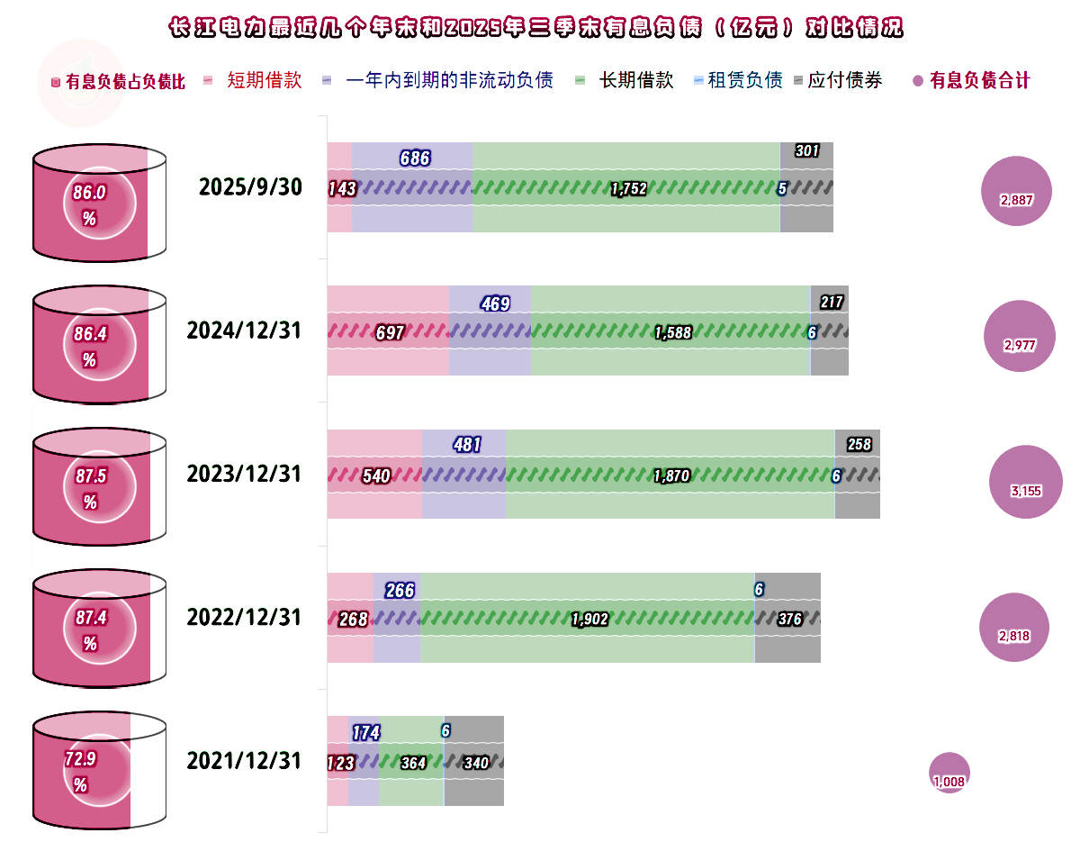 长江电力在2022年末的有息负债规模大幅增长至2818亿元,2023年末超过3000亿元并达到峰值,之后才逐步下降。
