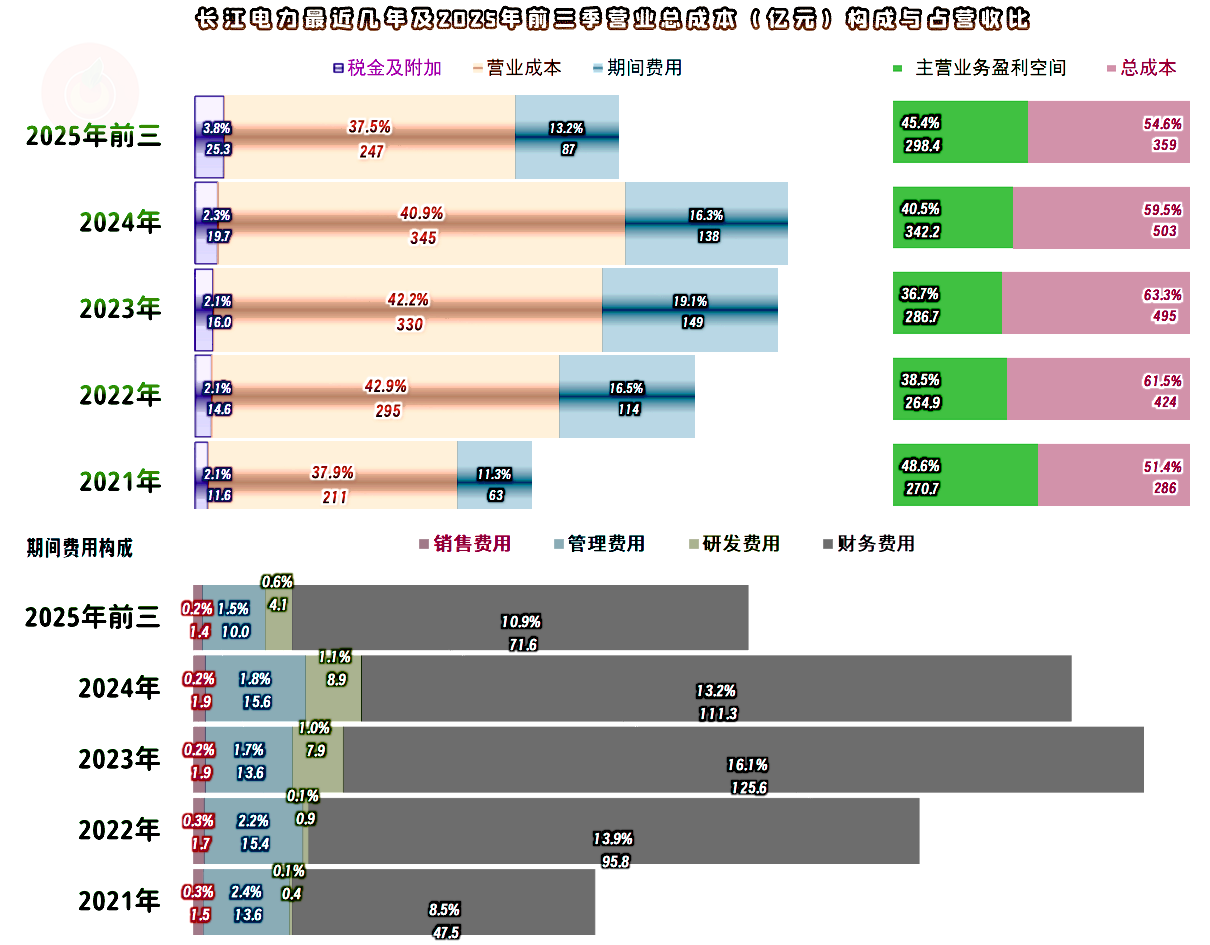 长江电力的毛利率在2021年都是超过62%的水平,2022年大跌至57.1%,随后逐步回升,2025年前三季度已经恢复至62%以上,与下跌前的表现差不多。
