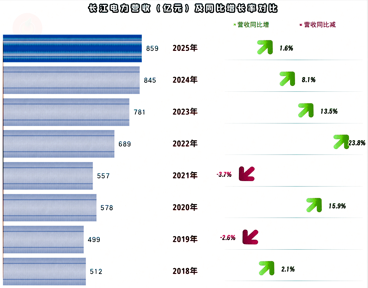 2025年,长江电力的营收同比增长1.6%,保持了连续四年增长的状态,只是增速是四年中最低的,已经有点增长不动的感觉了。长江电力主要经营水力发电及相关业务,实际上就是运营三峡等多家大型电站。