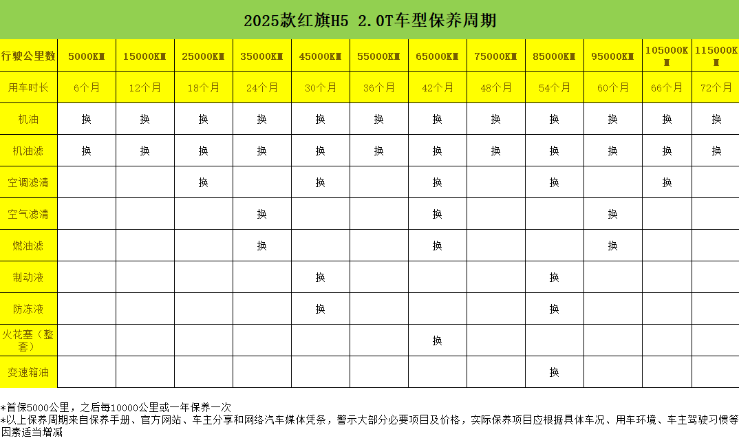 根据保养手册来看,2025款红旗H5 2.0T车型的首保为5000公里,一般4S店会免费赠送首次保养,包含材料费以及工时费,后续每10000公里保养一次。其中虽然有时候允许保养周期有一定浮动,但超出范围过长可能影响相关部件质保,所以建议用户按时保养。该款车在3年6万公里会进行2次小保养(换机油+机油滤),2次中保养(换机油+三滤)以及多次关键系统维护保养。