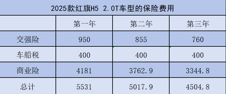 如果购买2025款红旗H5 2.0T车型商业险仅缴纳第三者责任险和车辆损失险,该车的保费并不算贵,而且不出险的情况下,费用会有所下调,前三年总计费用为15053元。
