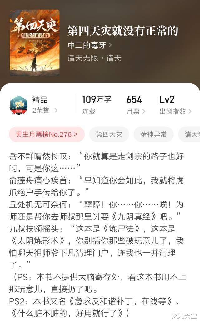中二的毒牙作品,上本《异界列车》普通精品成绩,这本第四天灾起飞。