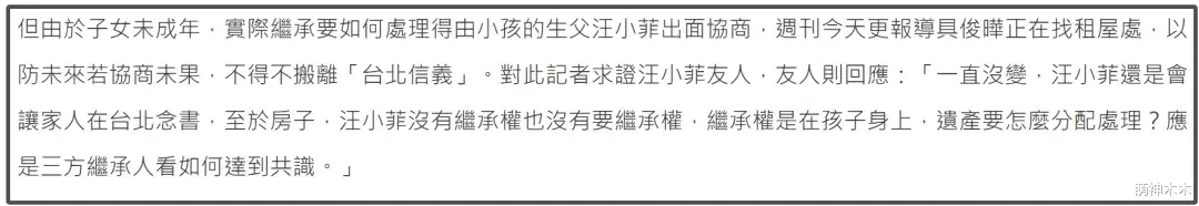 针对S妈的诉求,汪小菲也透过台媒发声了,他通过友人回应了“孩子就学问题”、“房产拍卖或售卖”、“大S遗产处理”几个重点,称两个孩子还是会继续在台北读书。关于房子,汪小菲没有继承权,两个孩子是继承人,遗产具体的分配要看三方继承人的共识。