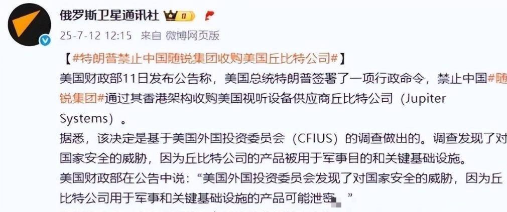 7月11日,美国财政部再次对中国香港企业采取行动,针对随锐国际收购美国视听设备供应商朱庇特系统的案子,提出要求中国企业限期退出。尽管该收购案已在2020年完成,特朗普政府依然以“朱庇特在军事和关键基础设施安全方面的重要性”为理由,要求中国企业撤资。
