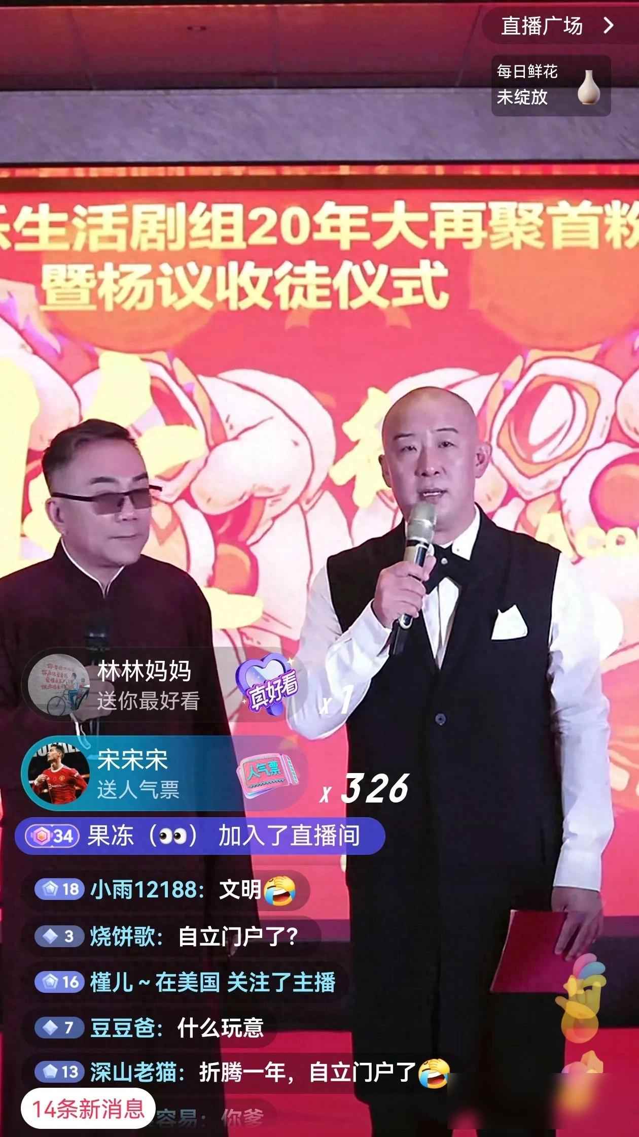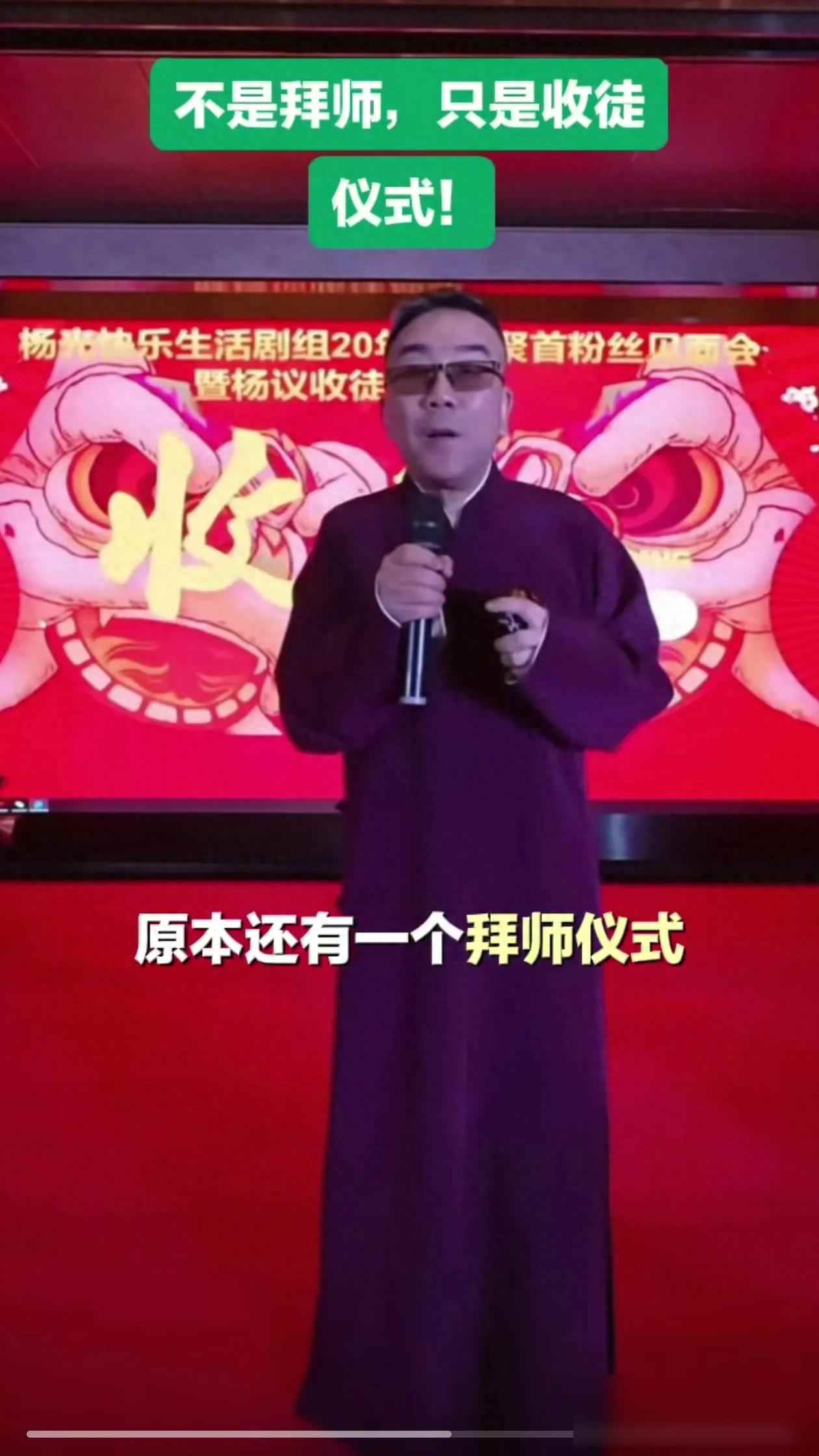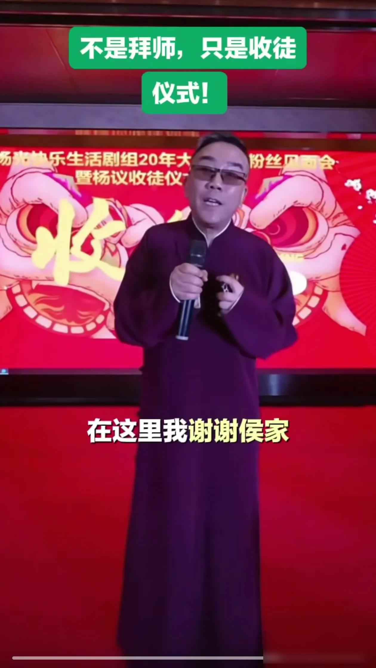 直播有七万多观众,现场人挤人,杨议说以后想拜师的还多。有人觉得他这是炒作,但也有人觉得相声该改改老规矩。杨议说收徒弟是互相帮忙,谁也不用给谁磕头。他爹杨少华在台上笑得挺开心,拄拐还跟徒弟们合影。