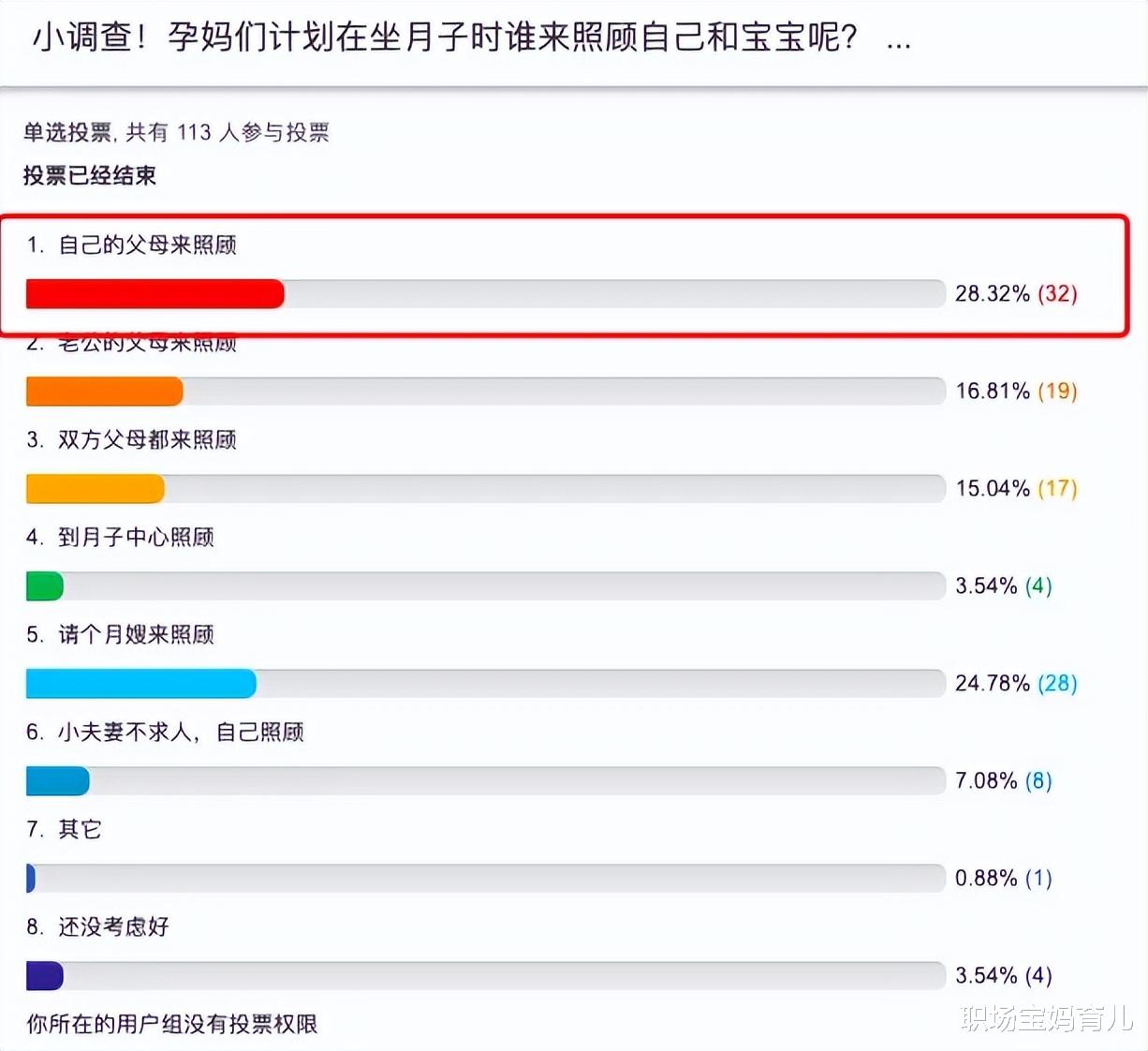 文文爸在朋友圈做了一个小调查,选择最多的是自己的的父母。网上也有类似的调查,在一份针对孕妈们计划谁来照顾月子的调查中,有接近30%的人选择了自己的父母来照顾。