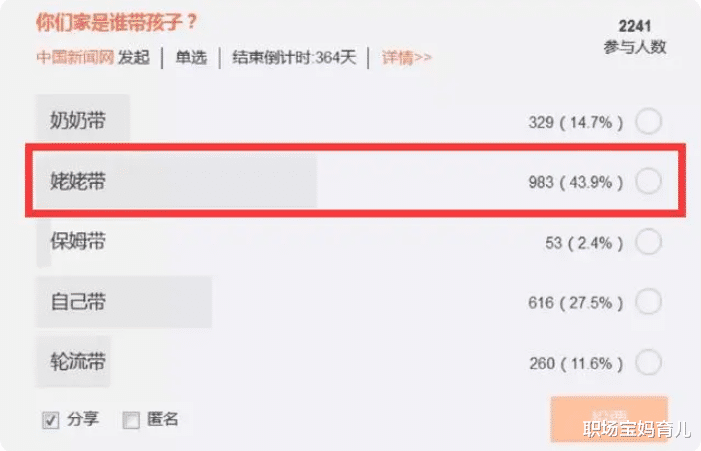 而在“你们家是谁来照顾孩子”的调查中,43.9%的网友选择了姥姥带,其次是自己带。