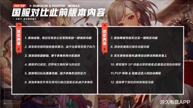 除了复制端游的经典副本和玩法外,DNF手游国服还增加了不少国服原创内容,包括附魔继承、徽章继承;降低礼包售价以及天空套合成费用;降低强化费用;以冒险团为核心的社交系统等等。