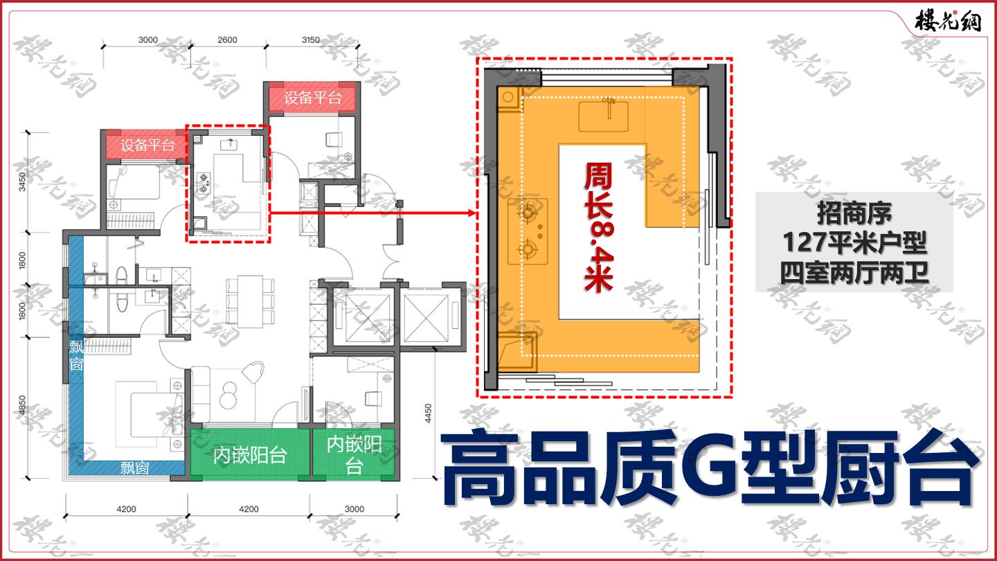 2、同样的理念,也体现在厨房上。招商序所有户型的厨房上,都设计了岛台,其中91和108平厨房为C型,127和165平更是做到了G型。