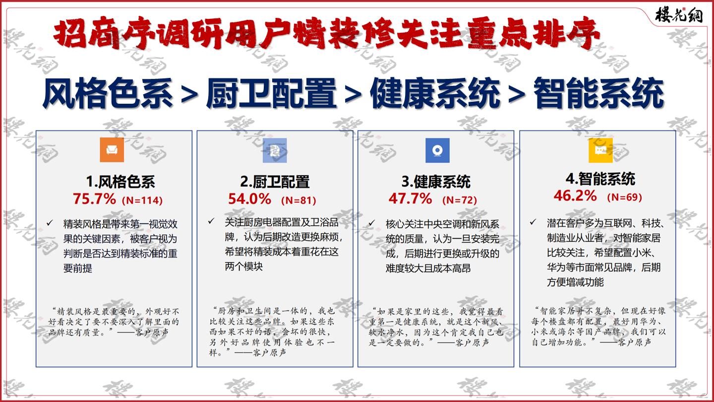 通过年初的调研,招商序发现客户关于房子精装关注因素的排序中,装修的风格色系排在了第一位,其次分别是厨卫配置、健康系统和智能系统。