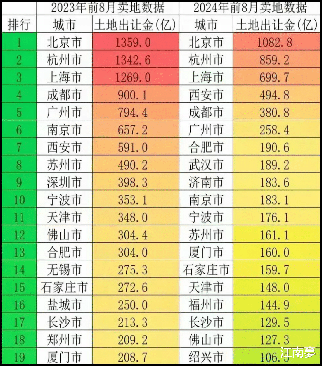 嵊州只能算是四五线城市,但是,放在全国的这么多县市里面,还是比较好的,毕竟还有其它行业可以依赖,比如:新能源、新材料、生命健康等。只是,整体发展速度上,会放缓。但是,对于那些高度依赖房地产的县市来说,不是放缓的问题,而是,面临“生死”的问题。以2024年前8个月的卖地数据和2023年前8个月的卖地数据多对比,几乎所有城市都在下降,包括:北上广深,其中,广州和深圳的降幅甚至超过50%。一线城市的土地,那么难“卖”,更何况那些四五线城市。