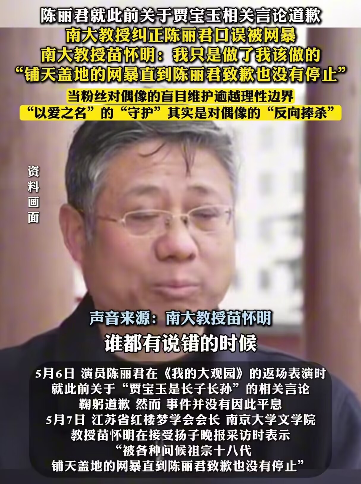 2025年5月,一场由越剧明星陈丽君引发的《红楼梦》角色解读争议,意外将南京大学文学院教授苗怀明卷入网暴漩涡。这场因"长子长孙"四字引发的风波,暴露出饭圈文化与学术纠错的激烈碰撞。