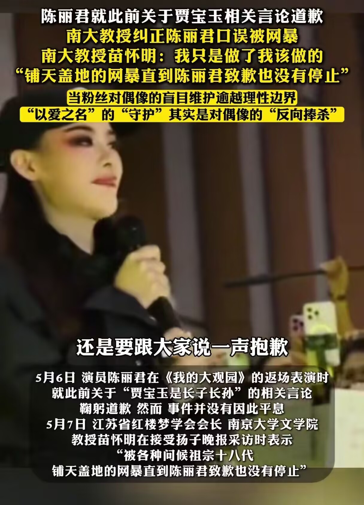 5月6日,陈丽君在返场演出中含泪致歉,承认"嘴和脑子未同步",表示将提升文化修养。然而部分粉丝仍持续攻击纠错者,现场高呼"陈丽君做自己",更有极端粉丝对苗教授及其同事、学生进行持续骚扰。这场网暴呈现典型饭圈特征:将学术讨论异化为"粉黑大战",用举报、谩骂代替理性对话。