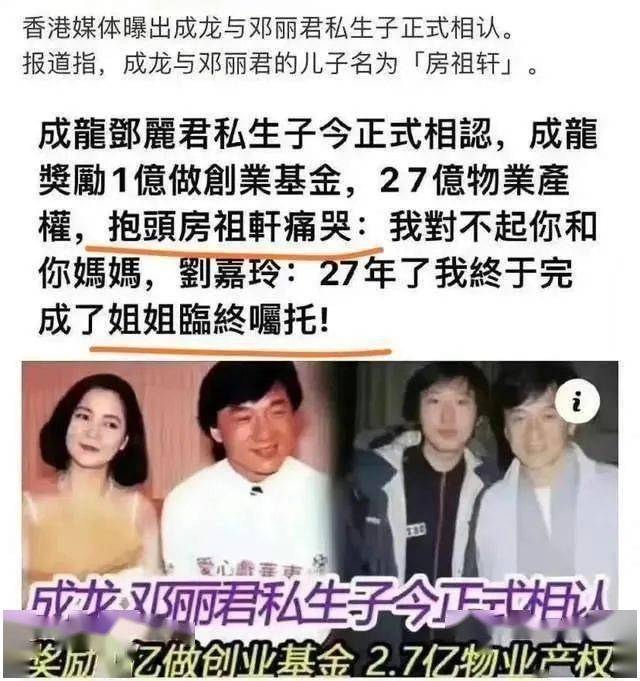 没记错的话,前两年港媒还曝过成龙跟已故的邓丽君有私生子,标题还写得有板有眼,并称成龙会奖励私生子1亿元作为创业基金,还有 2.7亿的物业产权,配文中也出现了所谓成龙与私生子的合照。