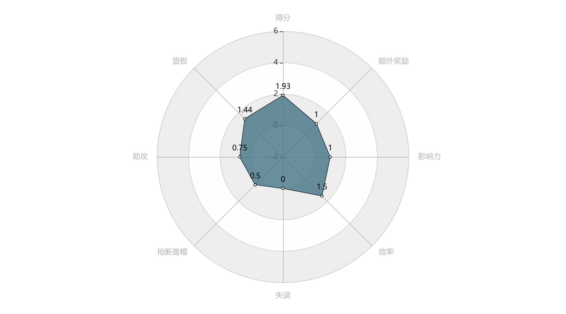 数据贡献评分效率评分1.5分华盛顿本场的真实命中率为52.08%,排在球队出场球员的第5位,与过去5场比赛华盛顿的真实效率相比,他的真实命中率略显不稳定6.22%,过去10场比赛的平均56.90%的真实命中率相比,差值下滑为4.82%。虽然效率保持不变,华盛顿却依然以精准无误的投篮稳稳把握住了比赛的节奏。
