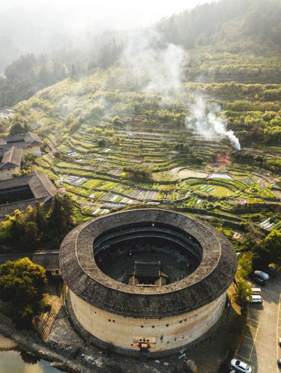 第二天清晨,阿婆带我去楼顶看日出。站在最高处,几十座圆楼方楼散布在山谷里,晨雾缭绕,炊烟袅袅。她说每座楼都有故事,像振成楼的主人曾是南洋富商,奎聚楼出过文武状元。回楼下时遇到她的邻居,一位八十多岁的老爷爷,正在院子里磨刀。“今天杀鸡,中午来吃。”阿婆替我答应了。那顿饭吃了白斩鸡、酿豆腐、笋干炒肉,都是客家味道。老爷爷说,土楼人好客,来了就是客,“你们来了,楼就还活着。”