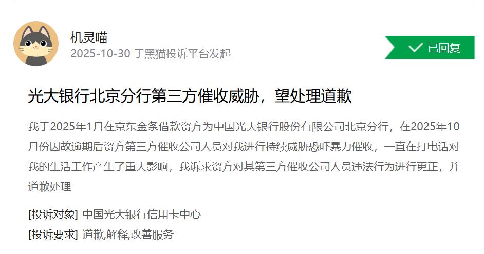比如,10月30日,一名消费者投诉称,其于2025年1月在京东金条借款资方为中国光大银行北京分行,在2025年10月份因故逾期后资方第三方催收公司人员对我进行持续威胁恐吓暴力催收,一直在打电话对他的生活工作产生了重大影响。此类投诉折射出光大银行在客户信息保护、内部管理上的短板,缺乏对第三方机构行为的约束。这不仅关系到消费者的切身感受,从长远看,也直接影响一家银行能否稳健经营和可持续发展。