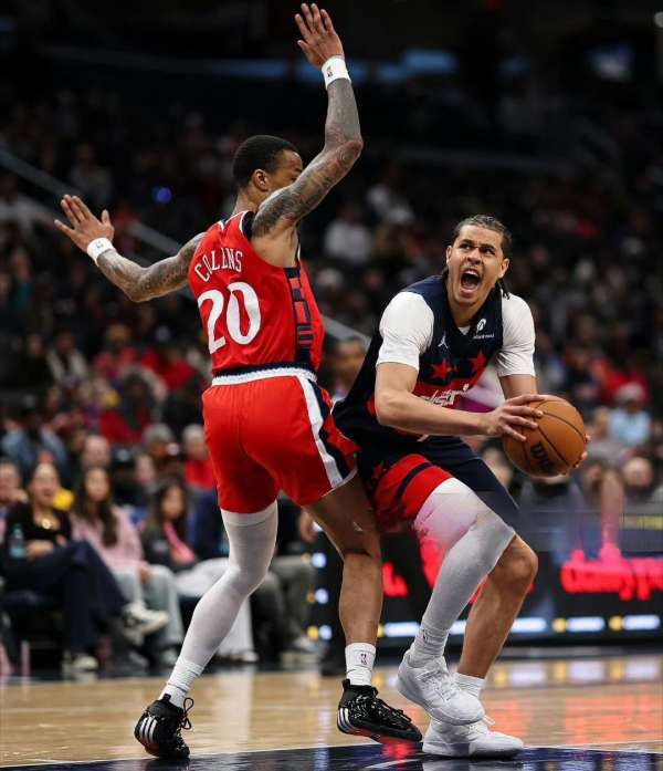 基肖恩-乔治身高2米03,臂展2米06,22岁,来自瑞士,2024年首轮第24顺位被奇才选中,在他进入联盟的第二个赛季,已经被奇才选做建队基石了。乔治的打法偏向于组织前锋,让人想到了老鹰的杰伦-约翰逊,魔术的班切罗,也有点像活塞的坎宁安。