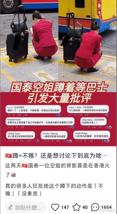 最近,国泰航空的一位空姐因为一张蹲在路边的照片在香港社交媒体上引起了轩然大波。
