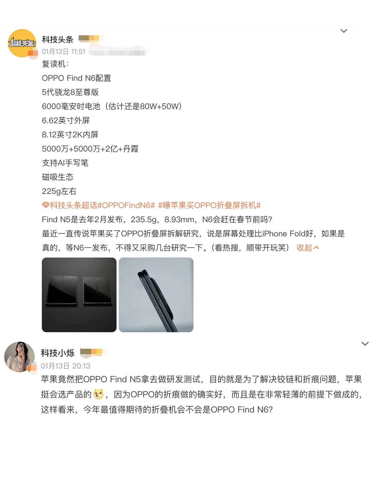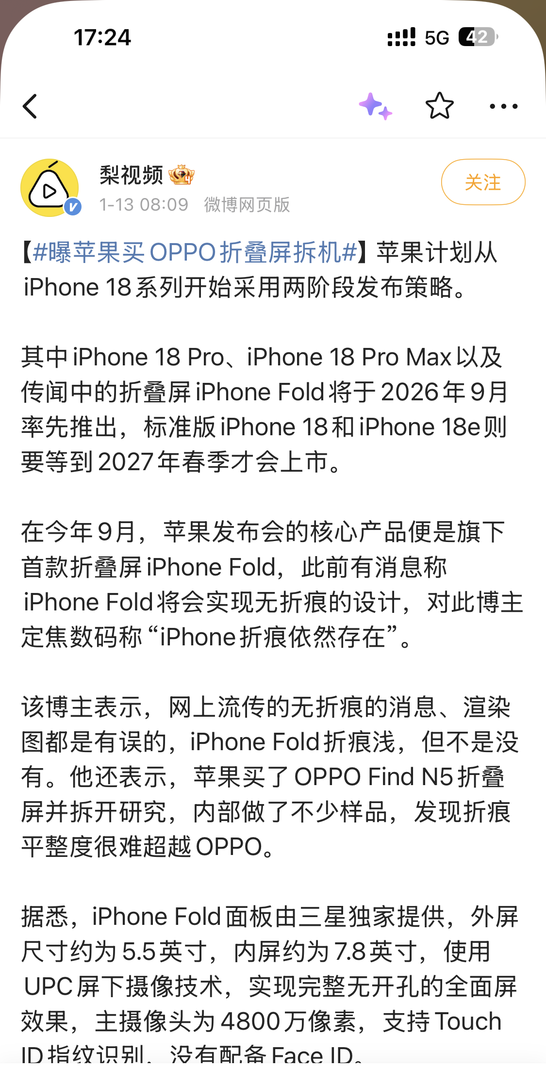 不知道这是什么操作,这两天老是看到苹果折叠屏的消息,我以为苹果能把折痕控制得很好,没想到啊,今天就看到一个热搜,一千多万人讨论,说苹果买了OPPO Find N5回去拆开研究,然后嘛,发现折痕控制不如OPPO...