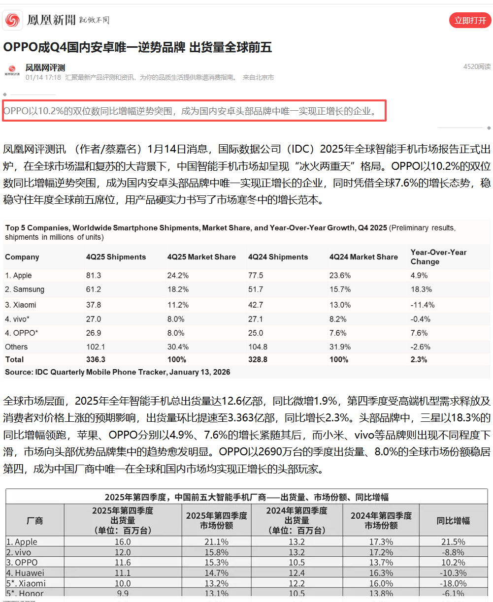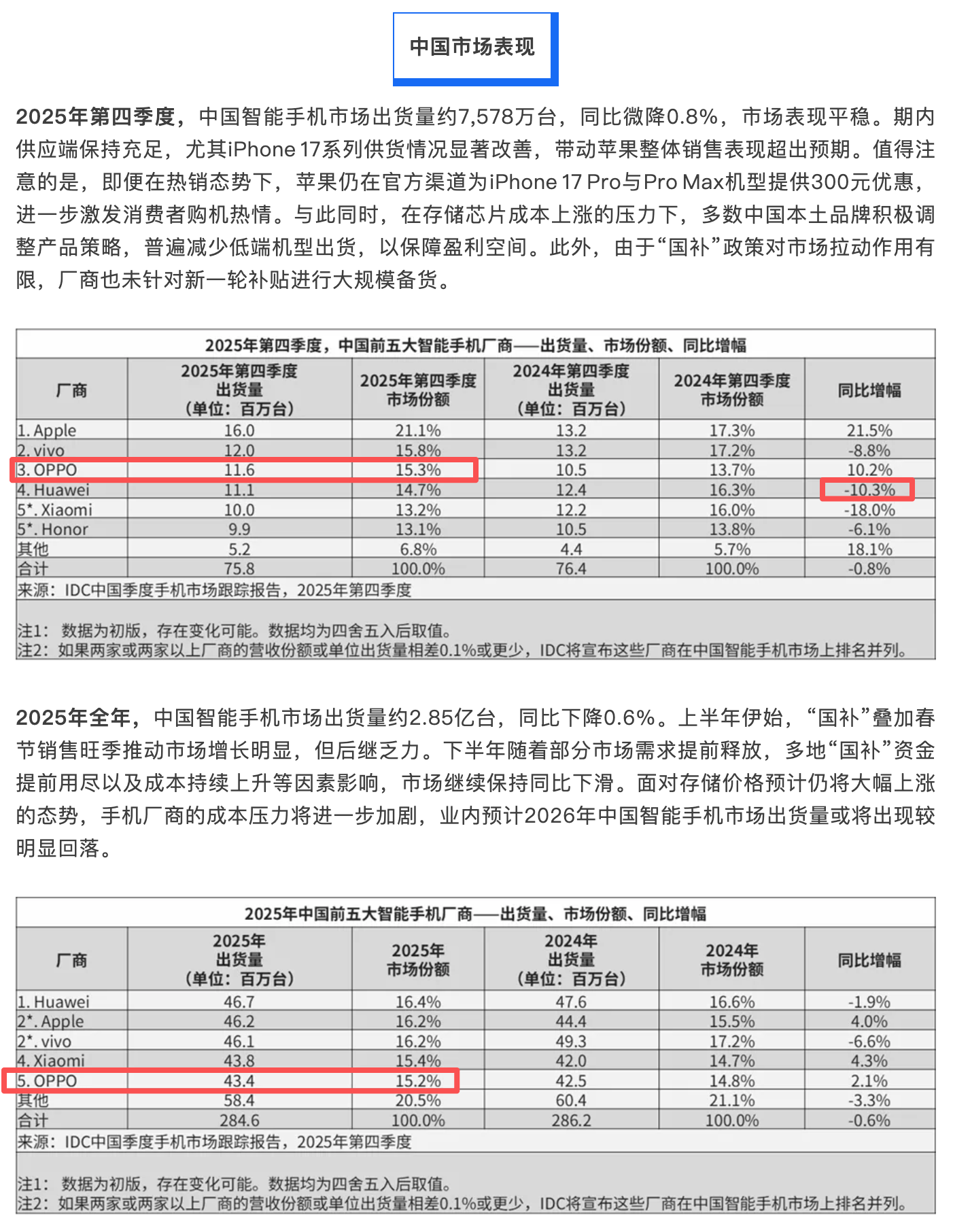 说到底,苹果之所以研究OPPO折叠屏,还是人家有技术,最新IDC数据显示2025年第四季度,OPPO是国内销量第三,还是wei一实现增长的国产安卓厂商,2025全年是国内前五,有销量、也有技术!