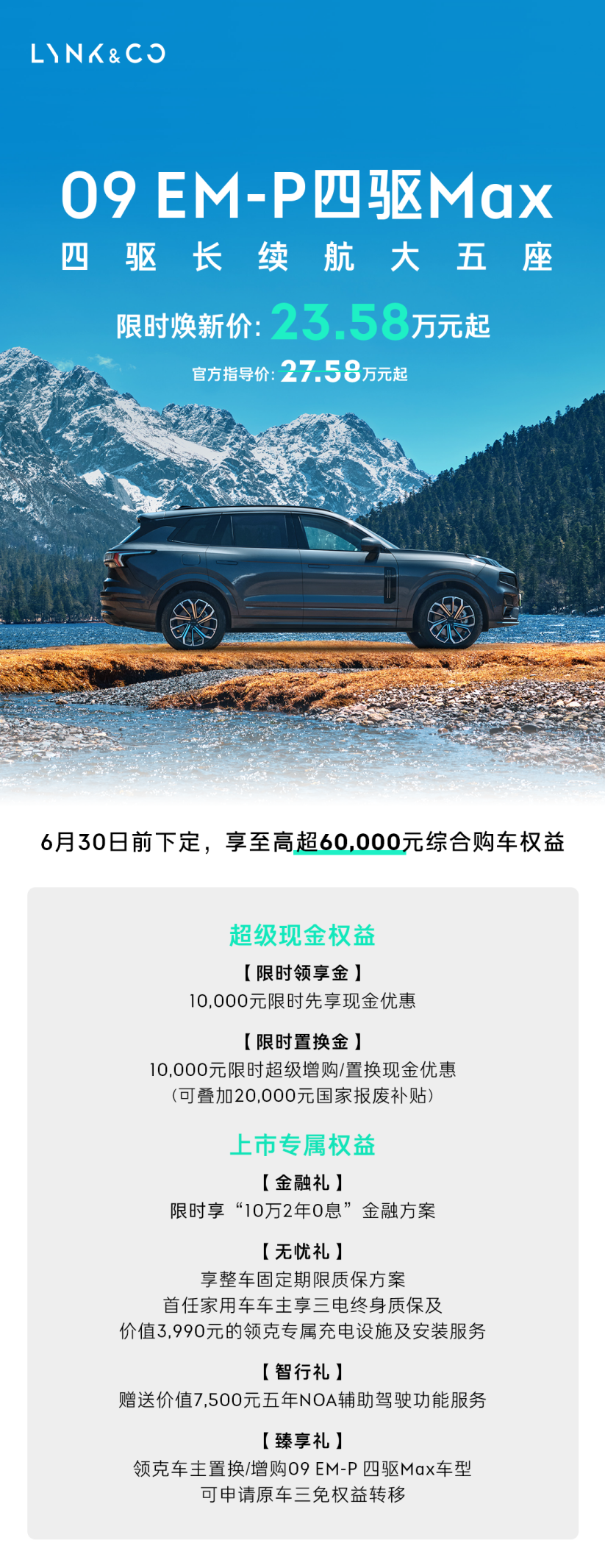 当市场上的其他车型还在为打造舒适的家用车而努力时,领克09EM-P四驱Max大五座却另辟蹊径,成功将驾控乐趣与舒适家用完美融合。对于消费者来说,无需再为选择注重驾驶体验的车还是注重家用舒适的车而纠结,因为这款车能够同时满足他们对驾驶和家用的双重需求。而且,在价格方面,领克也展现出了诚意。根据官方政策,在6月30日前下定,至高可享超60000元综合购车权益,还有10万2年0息的金融方案,限时焕新价23.58万起。如果你正在寻找一款既能满足日常家用,又能带来出色驾驶体验的大五座SUV,那么领克09EM-P四驱Max大五座绝对值得考虑。