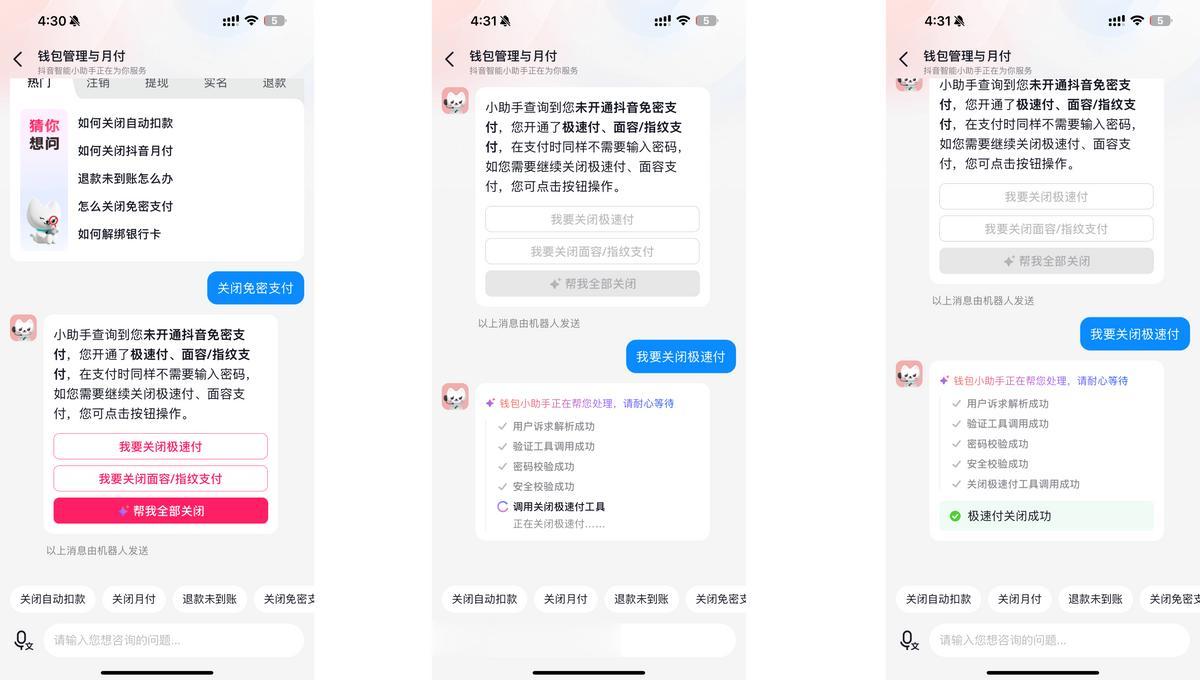 银行卡解绑:无需跳转钱包、支付设置等多个页面,客服界面内一步完成选择与验证,按钮清晰、交互简单; 视频审核加急:用户上传创作视频后,若发现视频长时间未发布,找到“我的客服”后输入“视频催审” 即可自动加急,不用再查找“创作者中心” 等入口; 支付功能管理:需要关闭极速付、免密支付等服务时,输入关键词即可直达操作,无需理解专业术语,验证流程简单直观。
