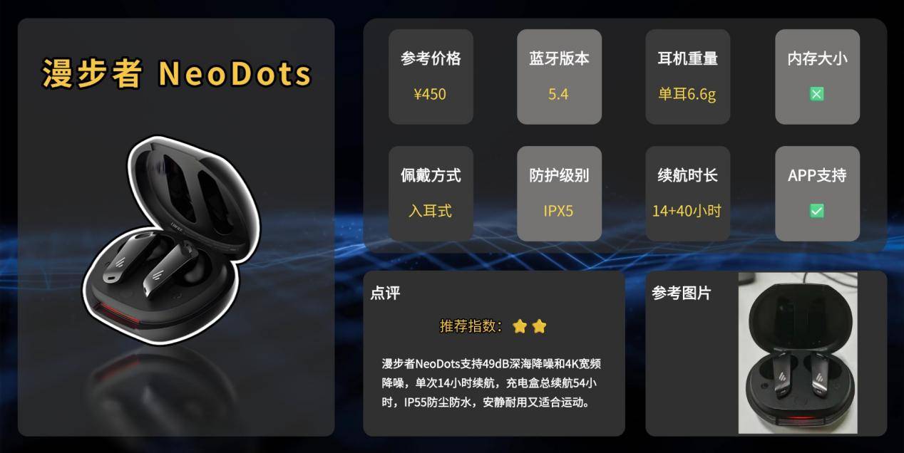 漫步者在耳机市场一直以高性价比和实用功能见长,技术研发在降噪和运动耳机方面也有积累。NeoDots在漫步者产品线中属于中高端降噪真无线耳机,主打深度降噪和长续航体验。