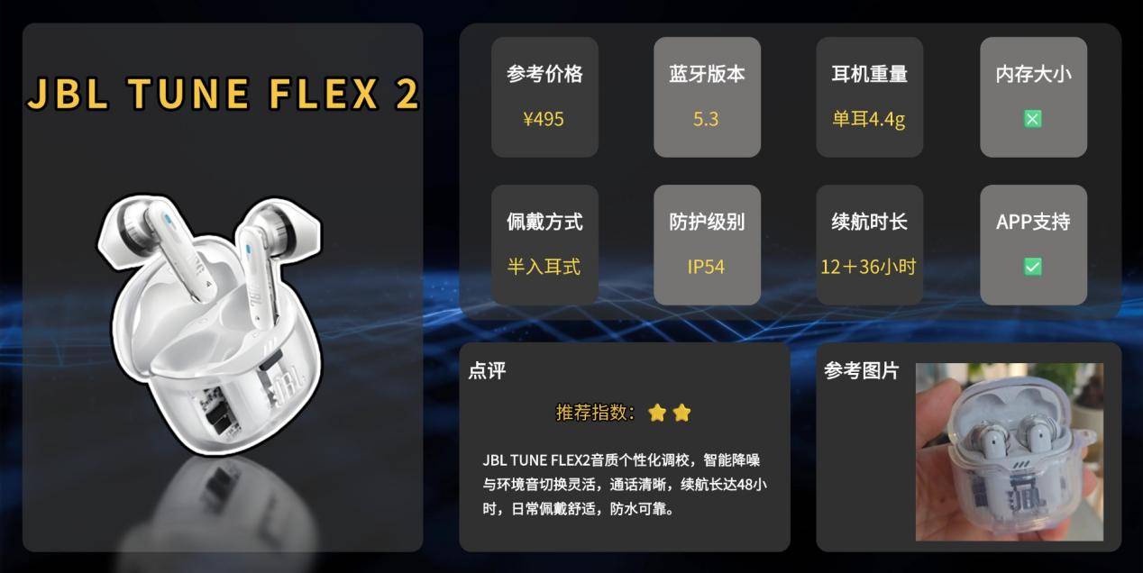 JBL属于国际老牌音频厂商,声音调校成熟,运动与日常耳机线多年沉淀;TUNE FLEX2在其中偏向智能降噪、通话与个性化听感的中端日常体验定位。