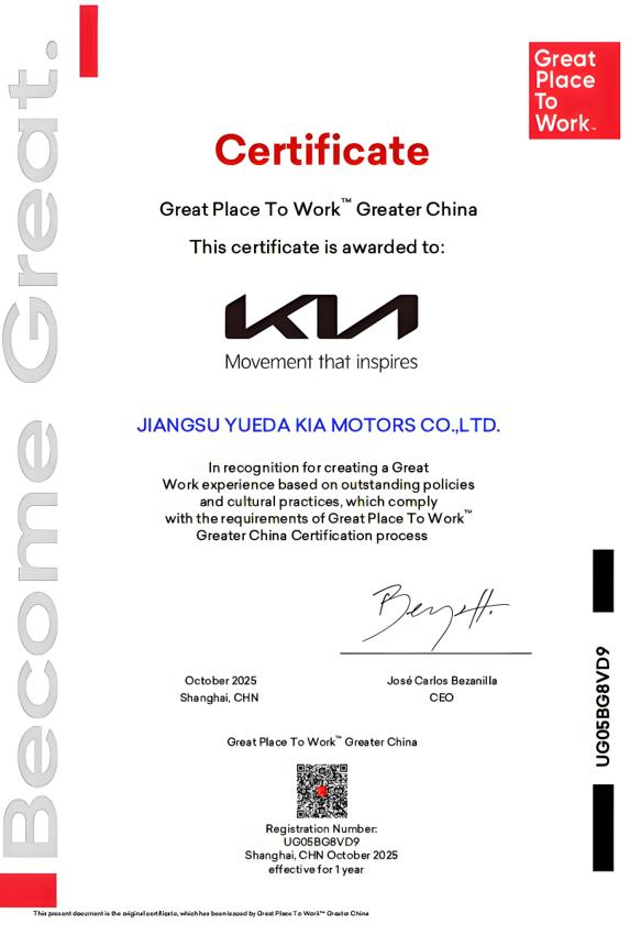值得关注的是,在行业极度内卷的背景下,悦达起亚积极推进组织文化变革,构建了企业与员工和谐共生、双向赋能的职场生态,深入践行“以人为本”的长期主义发展理念。凭借在职场文化、人才梯队、员工关怀等领域的卓越实践,悦达起亚以93%的员工信任指数,高分荣获全球权威职场文化评估机构——Great Place To Work® (卓越职场研究所)颁发的“卓越职场”认证,成为2025年中国汽车行业唯一获得此项殊荣的汽车企业。
