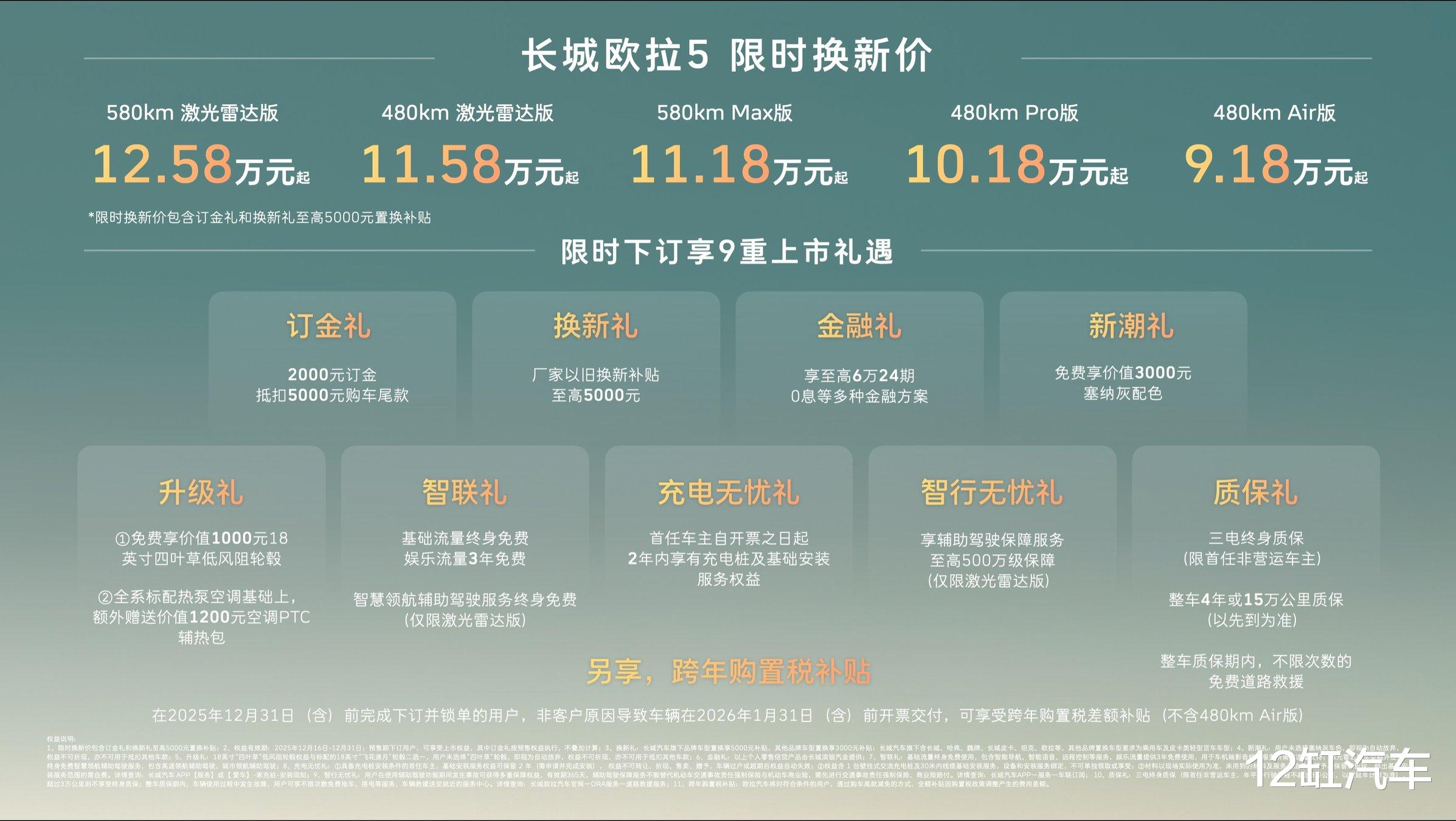 【中国·保定】2025年12月16日——今日,长城汽车欧拉品牌全新A级纯电SUV——长城欧拉5正式上市。新车共推出5款配置,建议零售价区间为 9.98万至13.38万元,限时换新价9.18万元起(限时换新价包含“订金礼”和“换新礼”至高5000元以旧换新补贴)。为回馈广大用户的热爱与支持,即日起至2025年12月31日,用户下订并锁单即可尊享包含订金礼、换新礼、智行无忧礼在内的9重上市好礼,以及跨年购置税补贴(不含480km Air版)等丰厚购车权益。凭借诚意十足的价格权益与越级产品力,长城欧拉5致力于成为全球年轻用户的“严选搭子”。