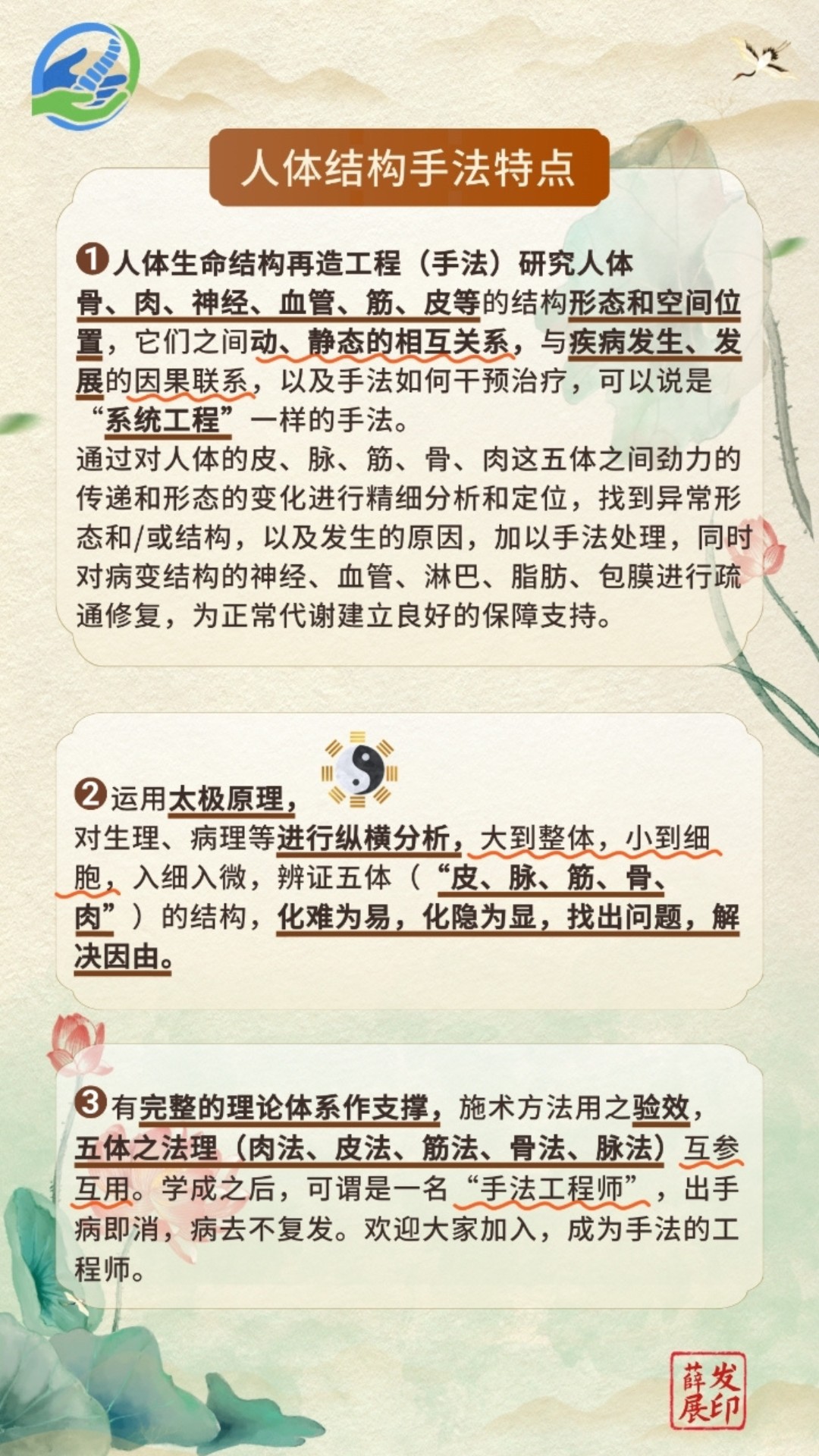 基于上述认知,“人体生命结构再造工程” 以太极拳的 “圆融运动” 理念为基础,结合解剖生理学的神经 - 运动闭环理论,研发出一套精密的手法调理体系: