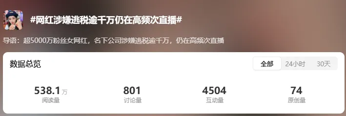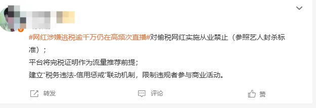 但离谱的是,虽然偷逃税这样的行为,会彻底终止他们继续赚钱的路子,但偷逃税者依然前仆后继,比如数据显示,2025年1-11月,全国查处明星网红等"双高人员"1818名,追缴税款15.23亿元,人均补税83万元。那么这到底是为什么?这背后就像某偷逃税的顶流所说的,"没有税务规范的网红",也就是说,是否被查都是概率问题,毕竟网红千千万,最后被查的,依然只是典型。尤其今天的一个热搜话题,让小柴醍醐灌顶,并不是所有的网红偷逃税就一定会被彻底封杀,这个话题是——5000万粉网红涉嫌逃税千万仍在高频次直播。