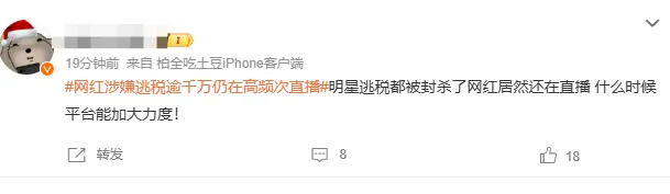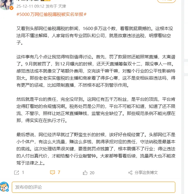 该网友还称:平台的责任,完全没尽到。这网红有五千万粉丝,是平台的顶流,平台肯定得盯着她的合规情况啊。税务处罚是公开的,平台不可能不知道,知道了还不限流、不警示,照样让她正常直播赚钱,监管完全缺位了。“明星逃税都被封杀了网红居然还在直播 什么时候平台能加大力度!”