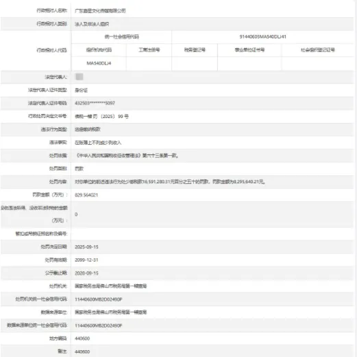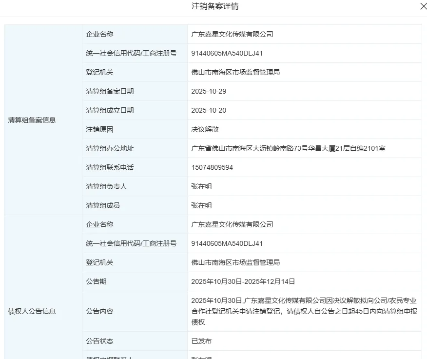 而值得注意的是,也有网友指出,就在今年9月收到巨额罚单后,广东嘉星文化传媒有限公司已于10月30日进入注销备案公告期,计划在12月14日后正式注销。