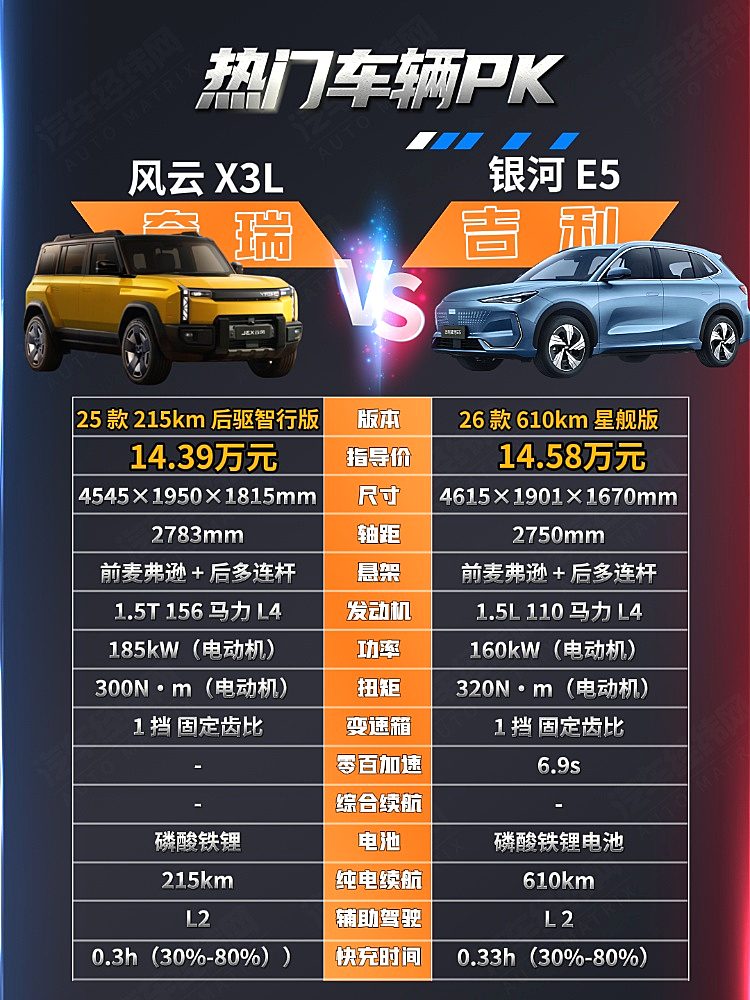 风云X3L 2025款215智行版指导价为14.39万元,吉利银河E5 2026款610km星舰版售价为14.58万元,两款车均为紧凑型SUV,售价比较接近,都面向中国的普通家庭用户,那么哪一款车更值得入手呢?
