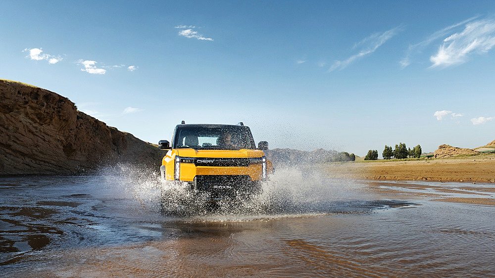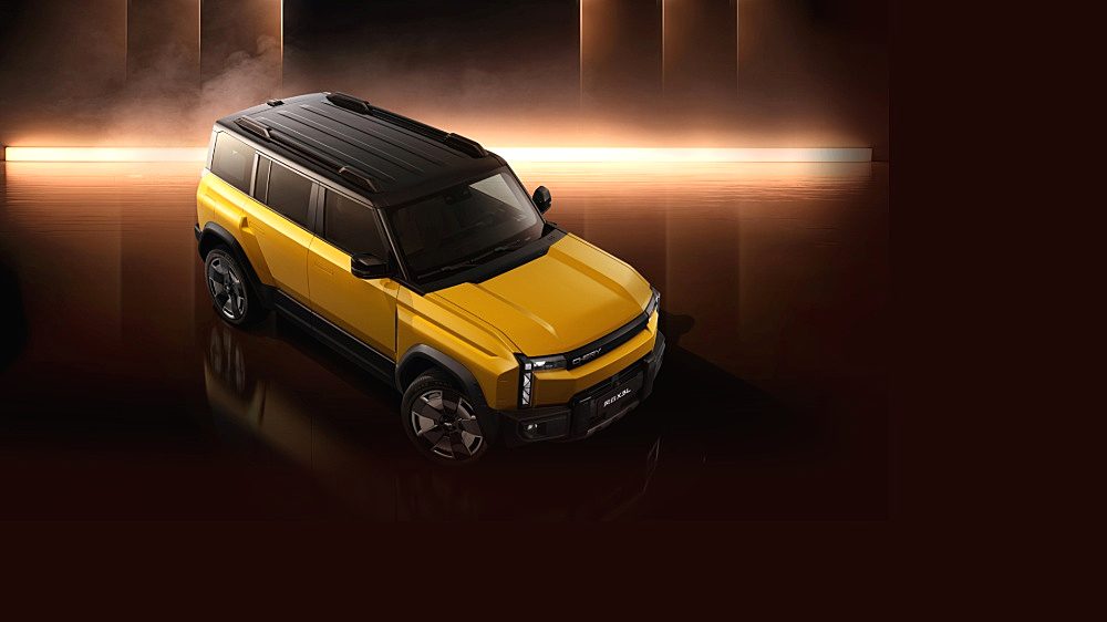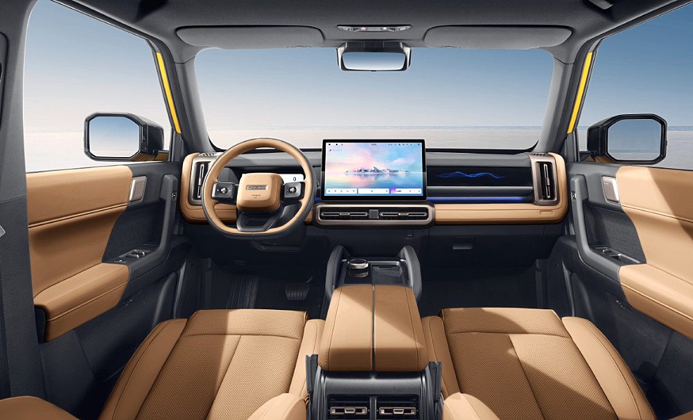 外观采用大量平直线条,前脸“倒L”型几何大灯与宽厚的熏黑前保险杠营造出坚实感,侧面的黑色轮眉、车顶行李架以及标志性的侧开电吸尾门和“小书包”式备胎,共同构成了适合户外的野性风格。