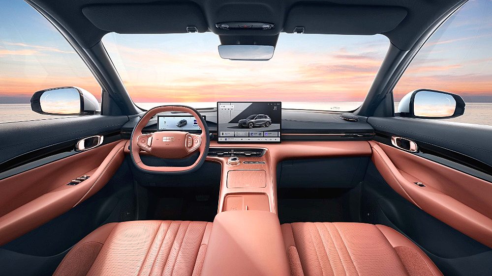 银河E5的内饰主打科技温馨风格,座舱内最引人注目的是由10.2英寸全液晶仪表和15.4英寸悬浮式中控屏组成的显示组合,整体布局简洁。