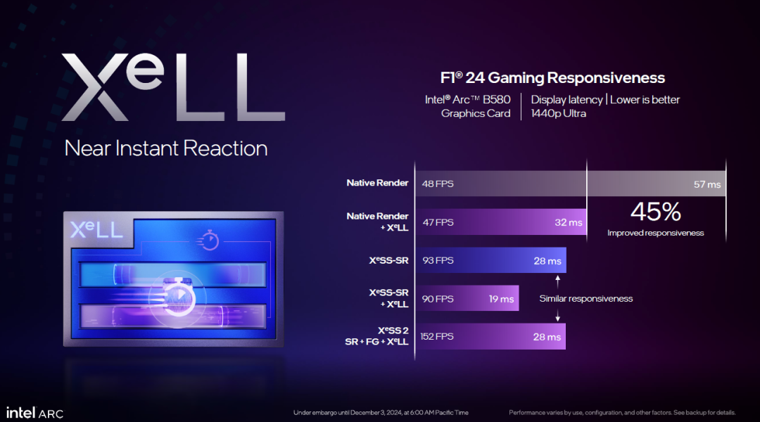 在游戏延迟降低方面,新一代GPU支持XeLL技术可以拥有更低的延迟。英特尔给出的案例显示,XeLL能够降低CPU等待队列延迟、显示延迟等,带来了整体延迟的降低。英特尔还提供了工具来测试延迟降低的情况,测试显示XeLL最多带来了45%的延迟降低,这对激烈的FPS游戏来说是极有帮助的。