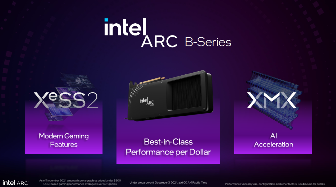 新的B系列GPU正是基于A系列GPU的市场优势而来,主要带来了三大方向的改进,一是全面加强的新一代游戏功能,比如更深入利用了AI计算的XeSS 2。二是带来了最好的单位价格性能,在性价比方面B系列GPU相比竞争对手产品都更有优势。三是结合英特尔在AI加速方面的技术积累,B系列GPU的XMX模块架构得以进化,AI算力和效能都得到了提升。
