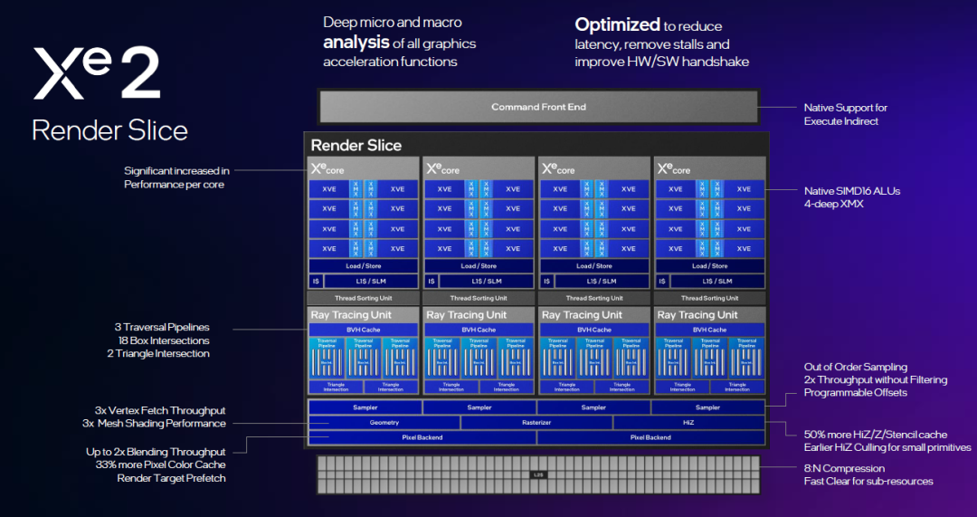 英特尔给出了一个Xe 2渲染片的架构图。一个完整的Xe 2渲染片,由4个Xe 2核心组成。英特尔提到了多方面的改进,包括但不限于:Xe 2核心的整体性能显著提升,光线追踪单元的性能显著提升,几何单元和像素单元的能力都大幅度加强。在计算能力方面,Xe 2目前可以执行SIMD 16计算之外,还可以执行SIMD 32的计算。针对AI计算,Xe2还可以执行TF32指令。此外,整个Xe 2渲染片的后端也有大幅度改进,比如采样执行吞吐量翻倍、Z轴消除的能力提升50%等。