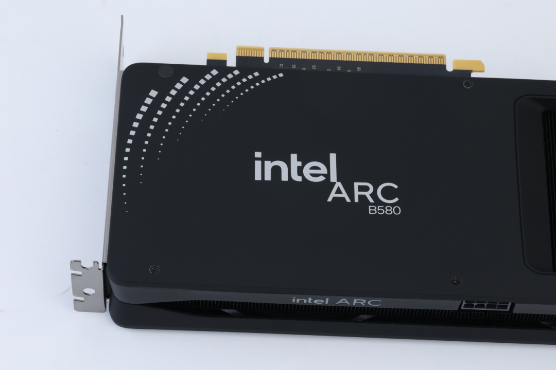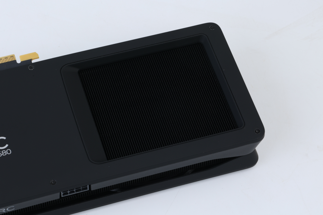 锐炫B580显卡在正面开有通风散热槽用于加强散热,注意,从解剖示意图中可以看到它采用的是短PCB设计,整体电路设计十分紧凑。