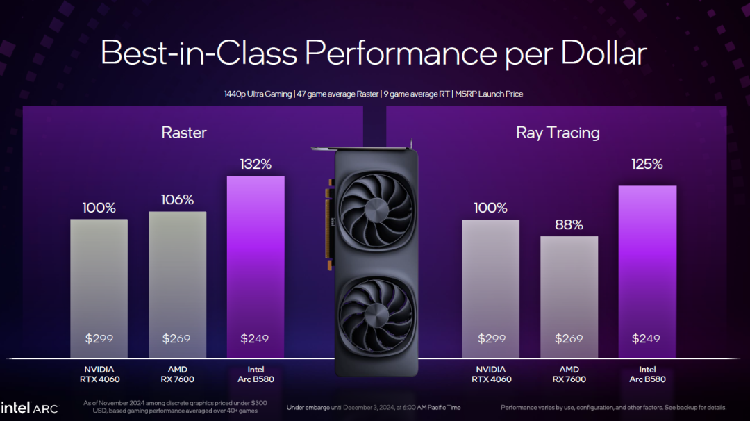性能方面,英特尔数据显示B580相比RTX 4060整体性能平均快了大约10%。