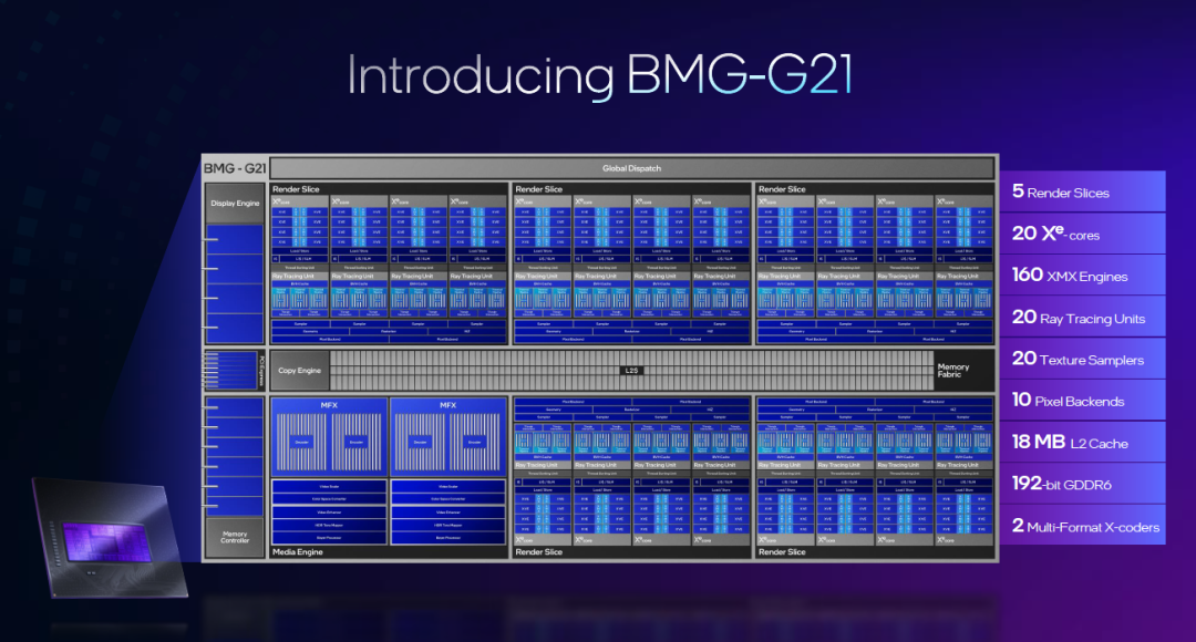 英特尔还展示了一个完整的BMG-G21的芯片图,可以看到包含了5个完整的渲染片,拥有20个第二代Xe核心、160个XMX单元、20个光线追踪单元、20个纹理单元、10个后端像素单元、18MB的L2缓存以及192bit GDDR6支持等内容。